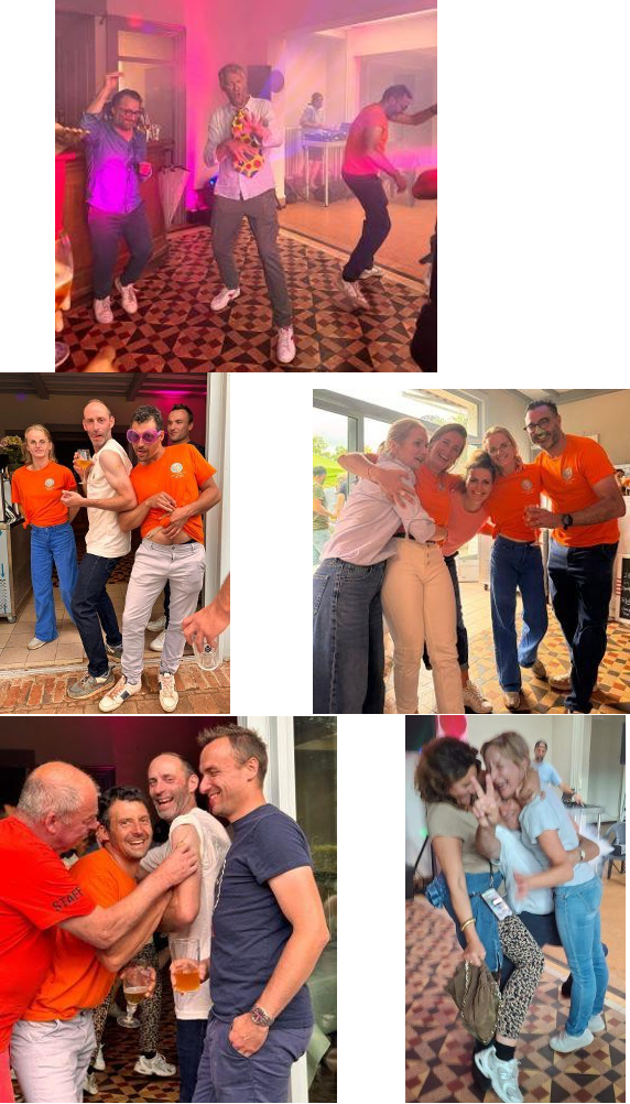 Le buffet froid, digne des grandes tablées familiales et dominicales, n’a pas réussi à faireredescendre la chaleur humaine qui progressivement, entre effluves de terre battue, de pluie d’été, de houblon et de vignes, commençait à gagner du terrain… Le rythme de DJ Arflodi battait son plein maisil fallait encore un peu de temps pour se laisser tenter par la piste. Puis ce fut l’explosion, comme une incandescence de danse, de joie et de rire mise en musique, nous portant jusqu’au climax de fête et de folie humaine, qui en réalité s’est étendue sur plusieurs heures faisant faire plus d’un tour d’horlogeaux racinguiens les plus insolents. Au programme – non répertorié dans le livescore –, danses endiabléesou réinventées, déguisement, pole dance, farandoles, certains ont même pu réaliser leur fantasme de victoire… Tout y était !